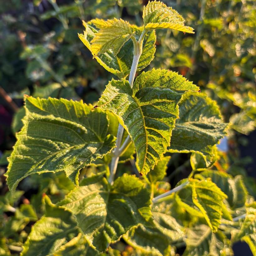 Leaves are dark green above, lighter green below, with reddish veining