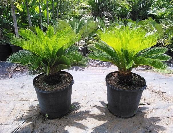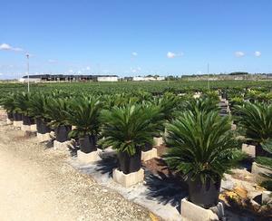 - Produces a crown of shiny, arching, palm-like, palmate leaves