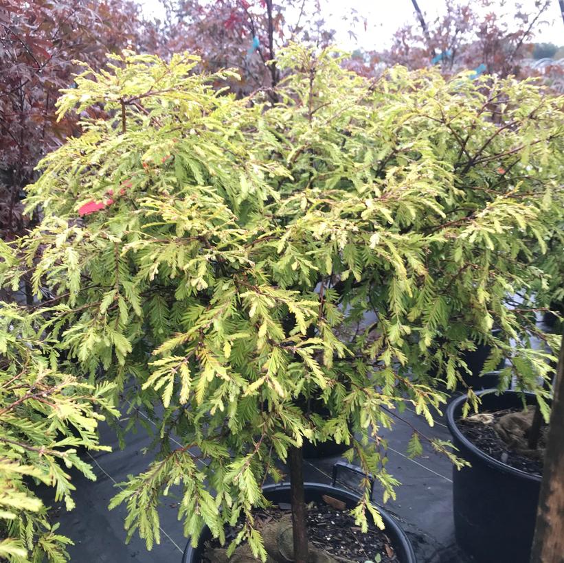 While metasequoia have the appearance of an evergreen, they shed their needles every fall. The branching of this unique weeping cultivar provides visual appeal in the winter. Needs protection from scorching afternoon sun.