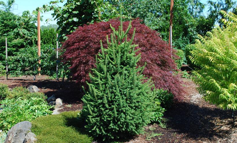 This columnar spruce is a good choice when planting in a confined area. They can also be planted in groups to make a privacy wall. Pinching the new growth will help maintain shape.