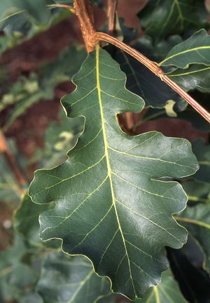 - Dark green leaves are leathery with deep round lobes and a distinctive 'waist'