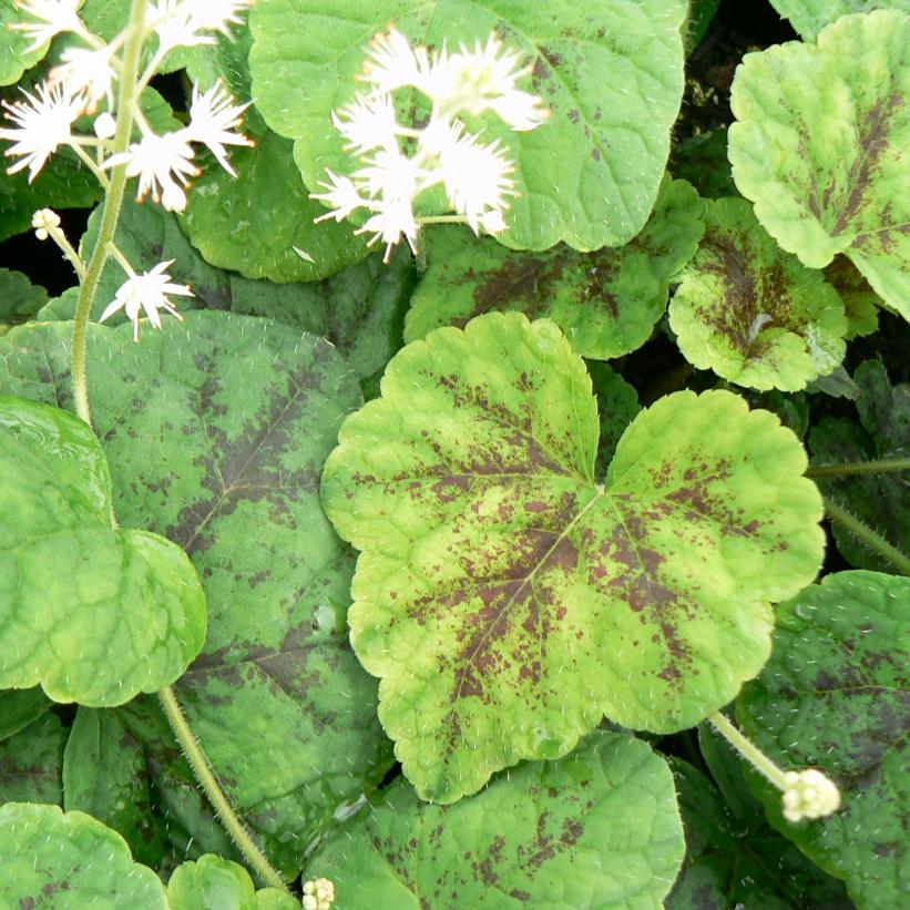 - Heart-shaped leaves with 3-5 lobes, 10 cm across, with darker variegation along veins