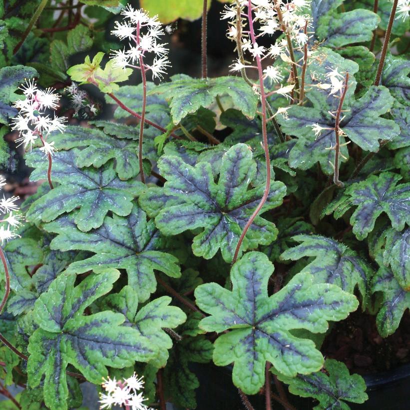 - Pink buds open to tiny star-shaped white flowers on short spike-like racemes