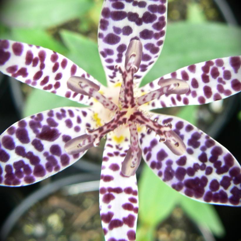 • White starfish-like blooms sport heavy blue-purple spotting or blotching